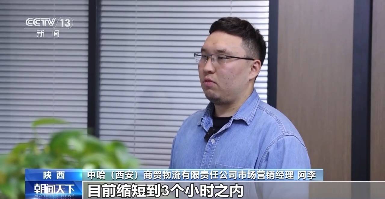 中哈(西安)商贸物流有限责任公司市场营销经理 阿李:实现数据云端共享,线上前置了查验、审批等多个环节,换装之前我们是3到4天的时间,目前缩短到3个小时之内。