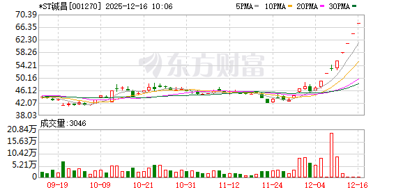 *ST铖昌再度涨停,8个交易日内录得7个涨停,累计涨幅为44.30%,累计换手率为19.72%。截至9:25,该股今日成交量5.12万股,成交金额345.48万元,换手率0.03%。最新A股总市值达139.11亿元,A股流通市值137.34亿元。